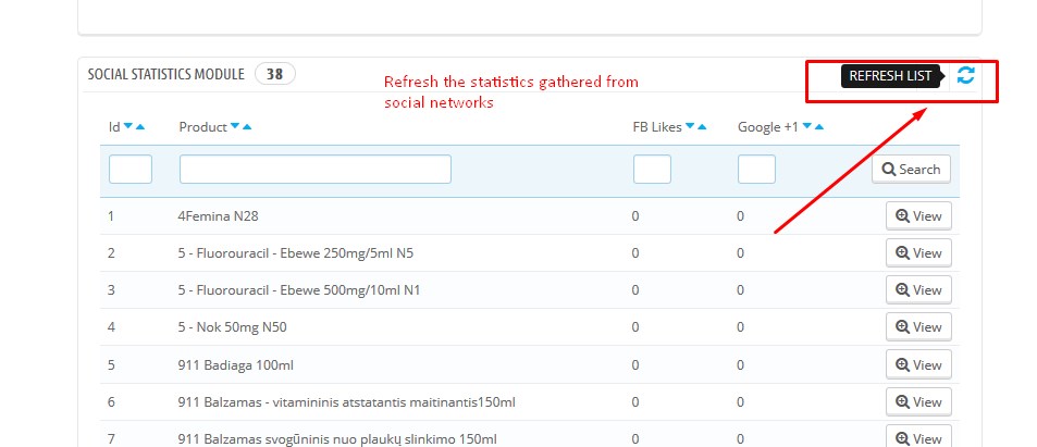 Modulul adaugă un widget special la tabloul de bord care arată aprecierile de pe Facebook și G+ pentru fiecare produs din catalog. Modulul funcționează cu PrestaShop >1.6.0.
